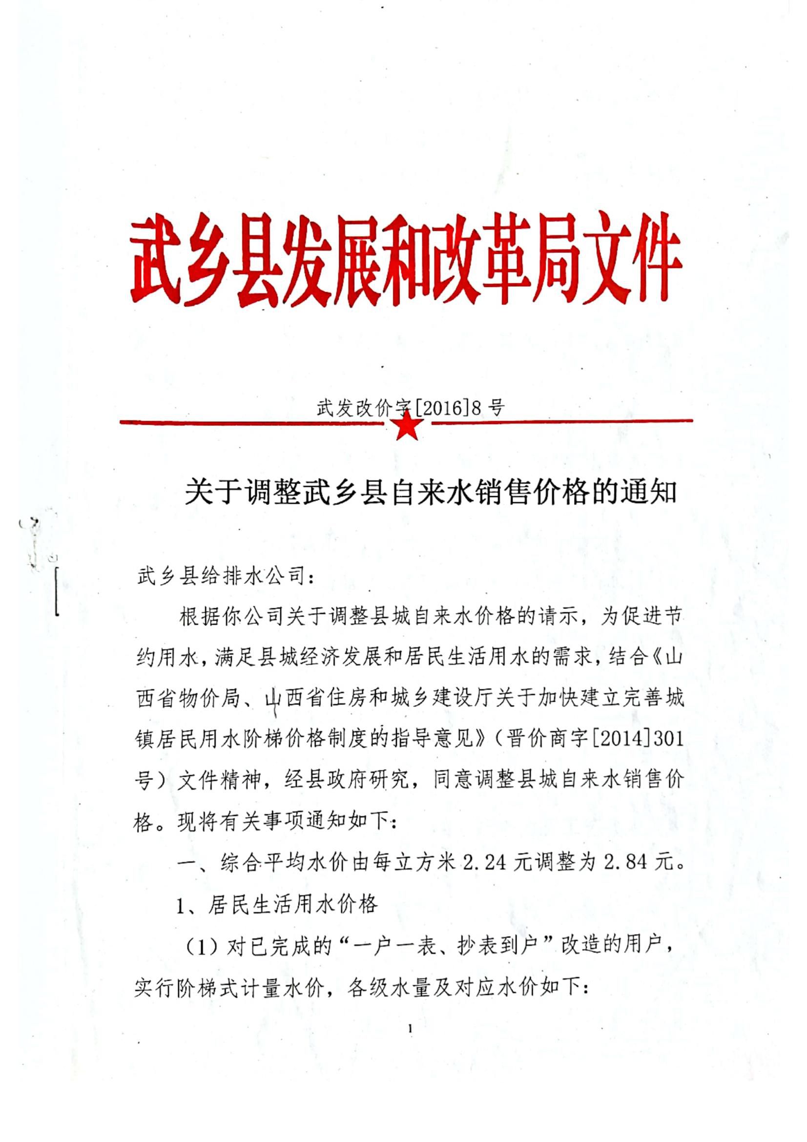 標 題關于調整武鄉縣自來水銷售價格的通知